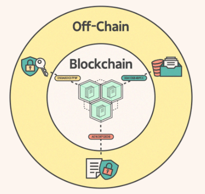 - 대신 블록체인 안에는 데이터의 지문인 해시값을 적고, 오프체인의 데이터가 바뀔 때마다 기록을 남겨 신뢰성과 투명성은 유지