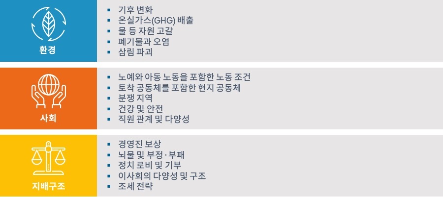 - ESG는 환경, 사회, 기업 지배구조(Environmental, Social and Coporate governance, ESG)를 뜻하며, 기업이나 비즈니스에 대한 투자의 지속 가능성과 사회에 미치는 영향을 측정하는 세 가지 핵심 요소이다.